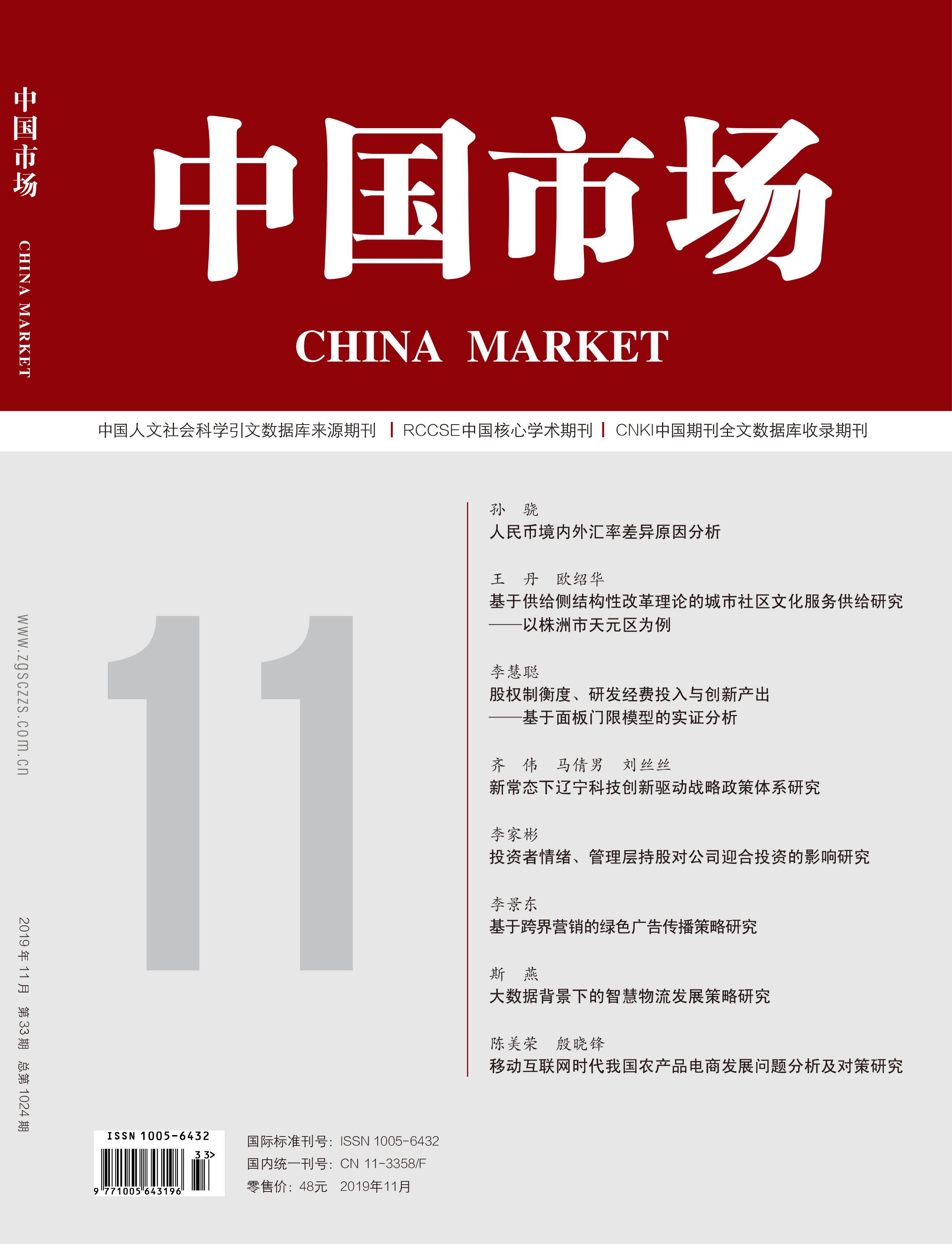 《中国市场》自1994年创办以来,紧密关注国家经济改革政策、经济方针政策,关注中国市场的现状、发展变化和未来发展趋势,关注国际市场动向,组织国内外重大课题的报道,致力于中国经济理论与实践的研究,探索中国经济发展的解决方案,引领中国经济改革方向,研究区域经济和城乡统筹发展,推动营销理念与模式创新,传播物流及供应链科技成果与智慧结晶,力求多角度多方位探究中国经济中长期发展战略的相关问题为市场投资群体、创业群体、企业决策人士提供全方位市场资讯。本刊曾入选《中文核心期 刊要目总揽》贸易经济类核心期刊,目前是中国社会科学院引文数据库来源期刊、中国人民大学“复印报刊资料”重要转载来源期刊、RCCSE 中国核心学术期刊。